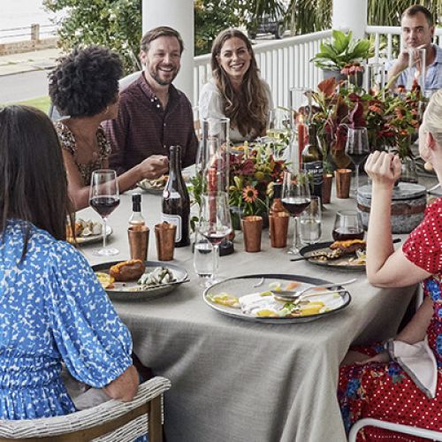 Gather Round: Dennis’s family and friends, including hosts Helen and Joseph Fields (in green), dig into the feast.