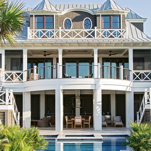 Their patience paid off, as Leah and Gee eventually scored an oceanfront property on an oak-lined street, which was originally developed in the mid-1950s. The site was just right—“I can open up the windows and hear the ocean,” Leah says—but the house situated on it was not; the couple decided to level it and start fresh. They tasked area architect Chris Rose and Atlanta-based interior designer Melanie Turner with conjuring a new home-away-from-home specifically tailored to their needs. Builder Nolan V. Sires completed the team.