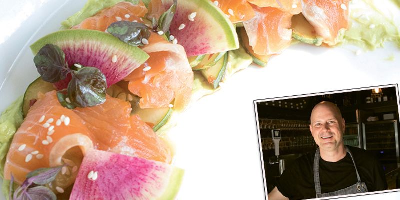 Sorghum & Salt’s Tres Jackson prepares an appetizer of cured salmon with salty-sweet cucumbers, puréed avocado,...
