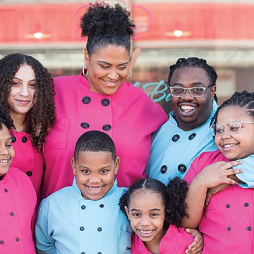 The Brown family in front of the bakeshop they opened on Reynolds Avenue in January.