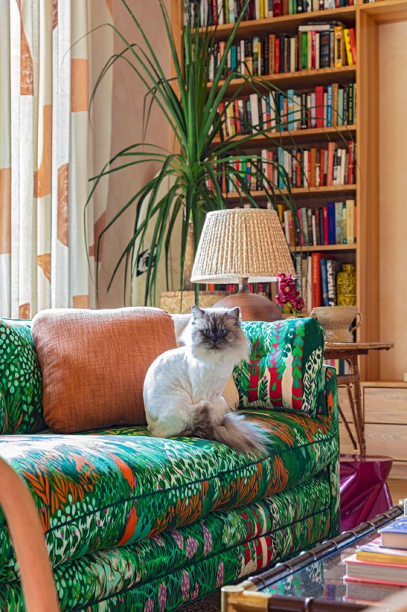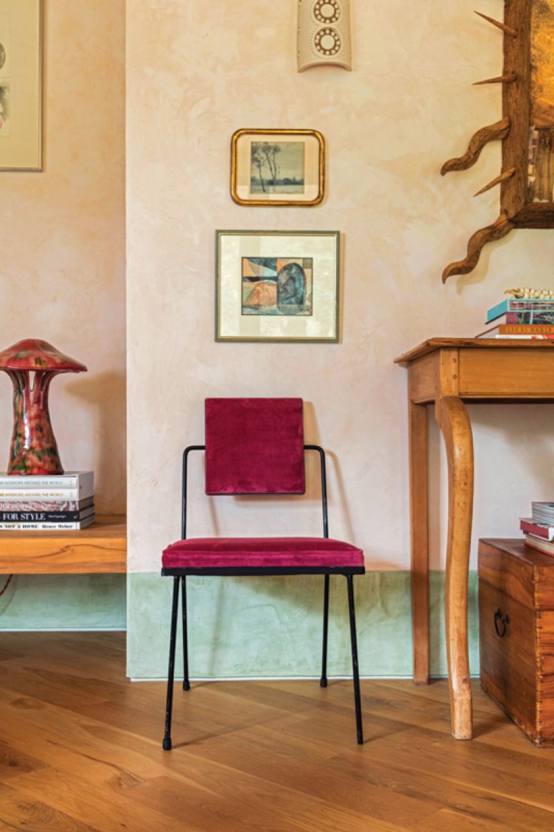 A vintage sofa covered in Jim Thompson’s “Melusine” fabric in “Sweet Nymph” dominates the main living space. Tucked under the end table is a fuchsia fiberglass stool from L.A. Studio in Madrid. But it’s the books that are the star of the show. “I incorporate bookshelves whenever possible into clients’ homes, and they are a source of joy and inspiration in my own,” says Hranowsky. “Books can tell you a lot about their owners. My collection is full of fiction and nonfiction, design books from interiors to graphics to architecture, along with art books and books I collect purely for the originality and beauty of their design.”