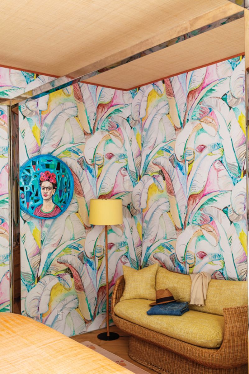 The primary bedroom is swathed in a vibrant, banana-leaf print. A collaboration between Voutsa and CW Stockwell, the pattern is a reinterpretation of Stockwell’s iconic “Martinique” print originally designed for the Beverly Hills Hotel. “For me, it’s a collision of Miami and Los Angeles, two cities I love,” says Hranowsky. She commissioned artist Doug Meyer to create the cameo of Frida Kahlo.