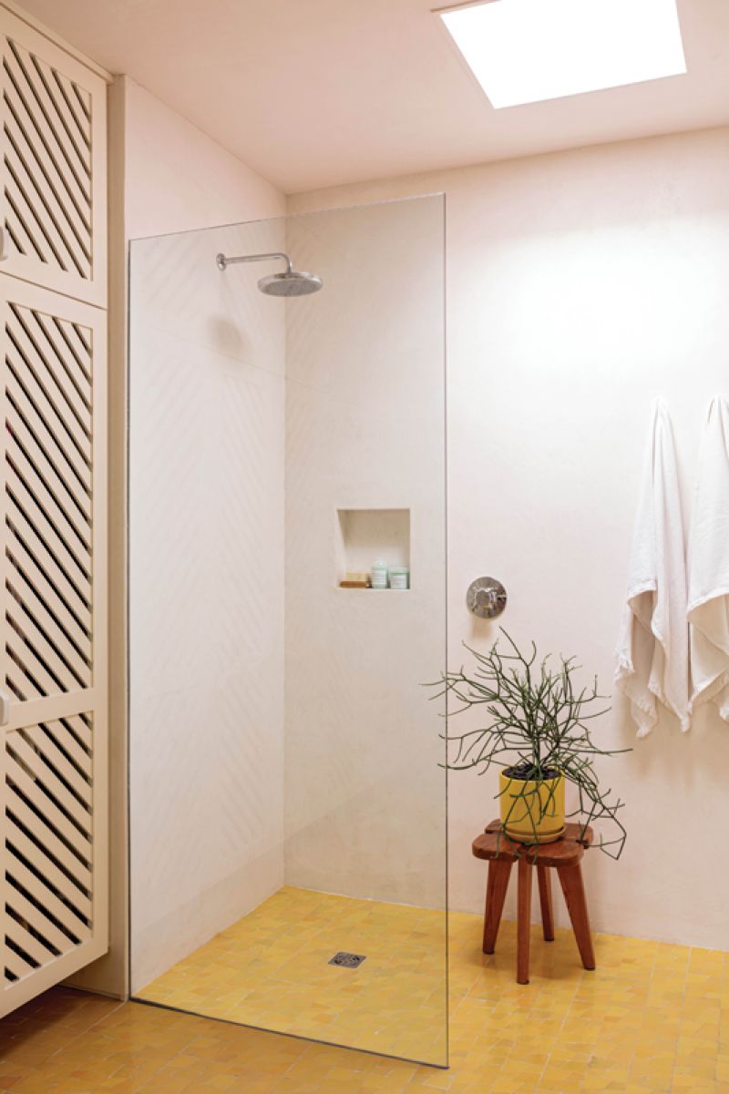 The primary bathroom does double duty as a large closet, with intricate lattice doors to contain clutter and allow the room to feel sophisticated and simple. The yellow tiled floor and lime-based, waterproof Tadelakt plaster create a warm, soft space that’s flooded with natural light.