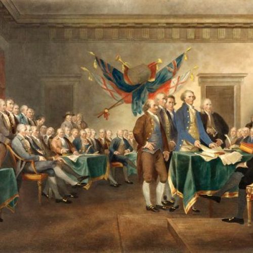 The “Committee of Five” (nearest the desk) present the first draft of the Declaration of Independence to the Second Continental Congress on June 28, 1776. It was officially adopted on July 4, 1776.
