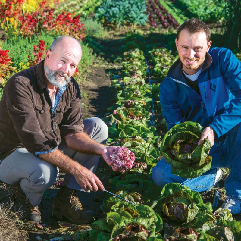 For a local harvest, the chef joined horticulturist Jim Martin at his boutique farm, Compost in My Shoe. “The cultivar Chioggia is an old, Italian heirloom variety that doesn’t grow uniformly in our Lowcountry environment,” Martin says. Instead, he grows Indigo radicchio. It’s close to Chioggia in taste and appearance, having the same green outer leaves enclosing a round purple-red head. (Martin’s produce is available through a weekly CSA farm share, GrowFood Carolina, and at farmers markets.)