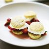 Cookson uses some of her strawberry haul to make delicate half-inch mini shortcakes with cornmeal biscuits. The biscuits’ crumbly nature contrasts with light whipped cream and makes them perfect for soaking up the macerated fruit.