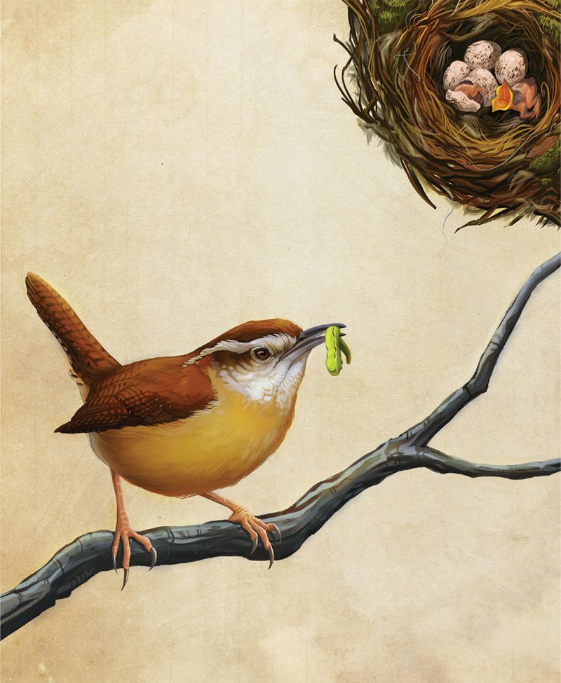 Loyal Lovebirds - Studies show that Carolina wrens tend to choose mates, with whom they generally pair for life, according to like size (they can grow as long as five and a half inches, with an 11.4-inch wingspan). Couples forage and move around their territory together, aggressively scolding away intruders.