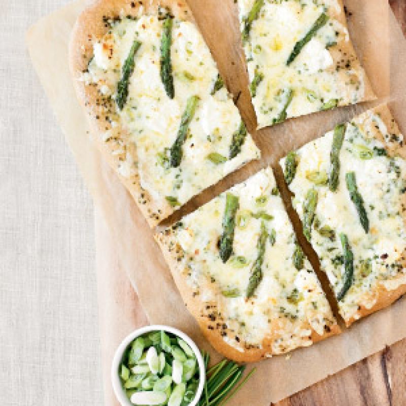 Preheat oven to 400°F. Roll pizza dough out to a 10 x 15-inch rectangle at 1/4-inch thickness. Transfer to a lightly greased sheet pan. Combine next five ingredients together and brush evenly over pizza dough. Spread fontina cheese evenly over top. Stir the mozzarella and ricotta together in a small bowl and place small dollops over pizza. Cut one-inch tips off asparagus and reserve stems for another use. Spread tips over top and sprinkle with green onion. Season with salt and pepper. Cook in center rack of oven for 15 minutes or until all cheese is melted and lightly browned. Slice and serve warm.