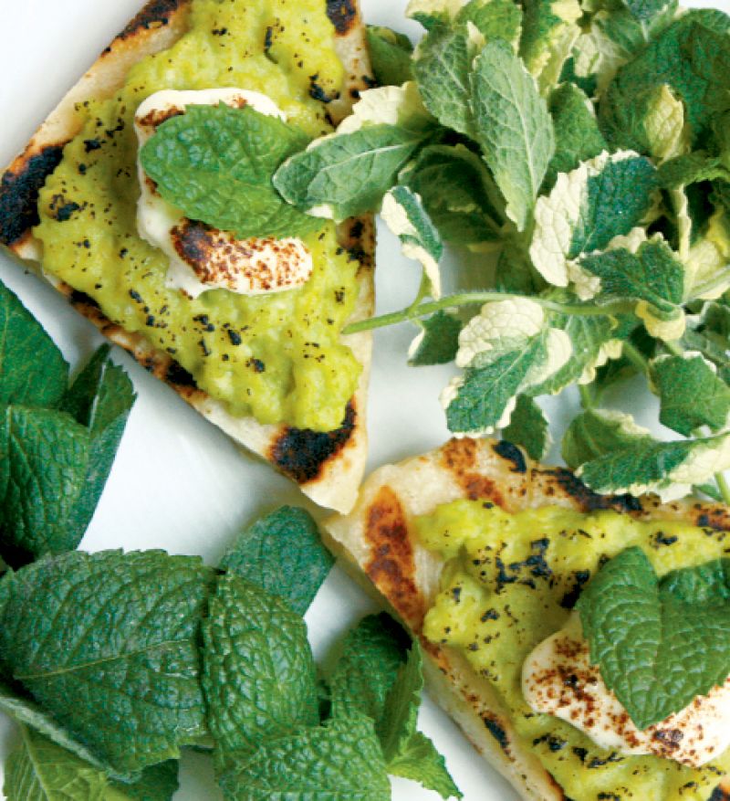 Place beans, garlic, lemon zest and juice, and extra-virgin olive oil in a food processor. Purée until smooth but slightly chunky. Season with salt and pepper. Fold in mint. Spread on warm flatbread. Top with crumbled goat cheese.