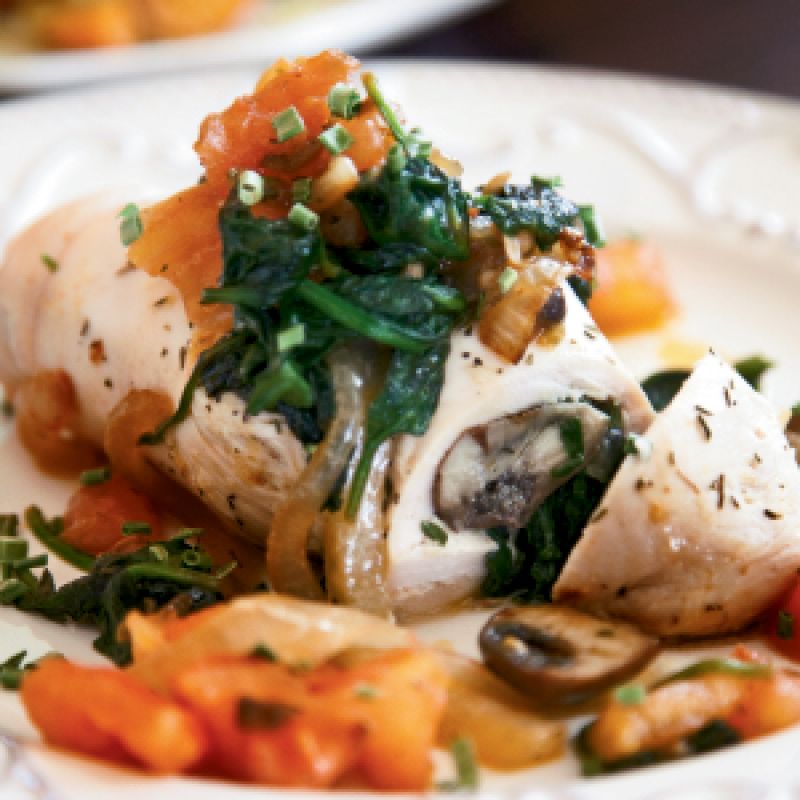 Preheat oven to 350°F. Rinse chicken breasts and pat dry. Cover with plastic wrap and pound flat. Remove wrap and rub both sides of each breast with one tablespoon olive oil and set aside. Sauté spinach, onions, and mushrooms in a sauté pan over medium heat with two tablespoons olive oil and remove from heat. Allow mixture to cool slightly before stirring in feta cheese. Set aside. Sauté chopped tomatoes in a sauté pan over medium heat with one table spoon olive oil. Set aside. Season chicken with thyme, rosemary, and sea salt. Divide spinach mixture into thirds, and set one-third aside. Divide the two-thirds portion into four, and spread one fourth on each chicken breast, roll, then secure with toothpick at the center. Repeat for each breast. Bake for 20 minutes. Top each serving with remaining spinach mixture (about two tablespoons each) and garnish with cooked tomatoes and chopped chives.