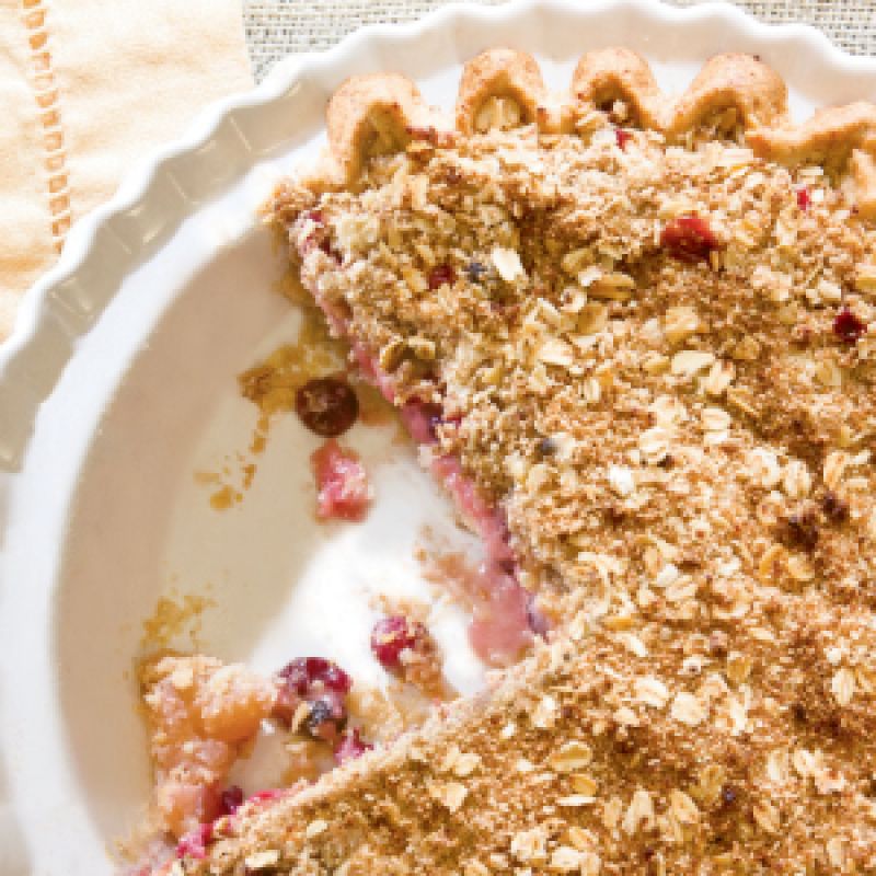 Remove pie from fridge and sprinkle topping over the pear and cranberry mixture.