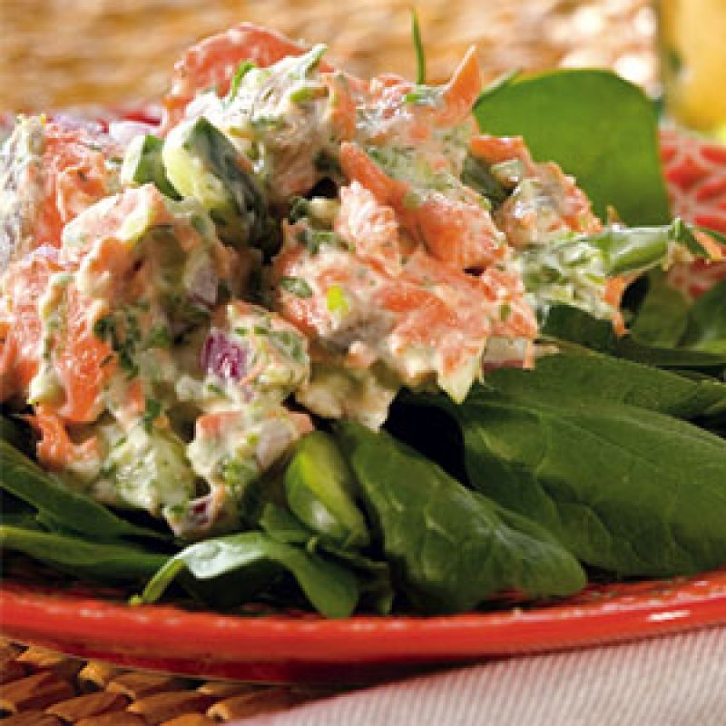 For the dressing: Combine the mayonnaise and sour cream in a small bowl. Finely chop the garlic in a food processor. Add herbs, onions, anchovy paste, and vinegar, blending until smooth. Transfer the ground herb mixture to the bowl, stirring until well-combined. Sauce can be made one day in advance. For the salad: Preheat oven to 350ºF. Place salmon on a greased baking sheet, skin side down. Drizzle the fish with olive oil and sprinkle with salt and pepper to taste. Bake for about 13 minutes for medium-well, or until desired temperature. Remove from oven and let cool. Meanwhile, bring water and 1/2 teaspoon salt to a boil. Add green beans and cook until tender, about four minutes. Drain and rinse with cold water. Remove skin from salmon. Loosely break up salmon fillet in a medium bowl. Stir in green beans, cucumber, red onion, and egg. Fold in dressing and chill until serving.
