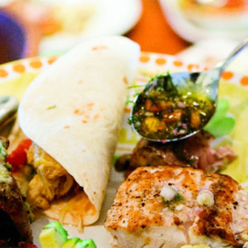 Wrap the tortillas loosely in foil and warm them in the oven for six to eight minutes. Place the fillets flesh side down on the grill. Sear them for two to three minutes, or until lightly charred. When the flesh-side is golden, turn the fish over and continue to cook through. Place on a platter and allow to rest for a few minutes, then break into pieces.