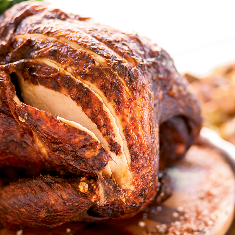 Generously rub front and back of outside of turkey with hazelnut butter. Pull neck skin to back and twist wing tips to back as well in order to hold skin in place. Tuck legs under band of skin or tie legs to tail with cotton string or butcher’s twine.