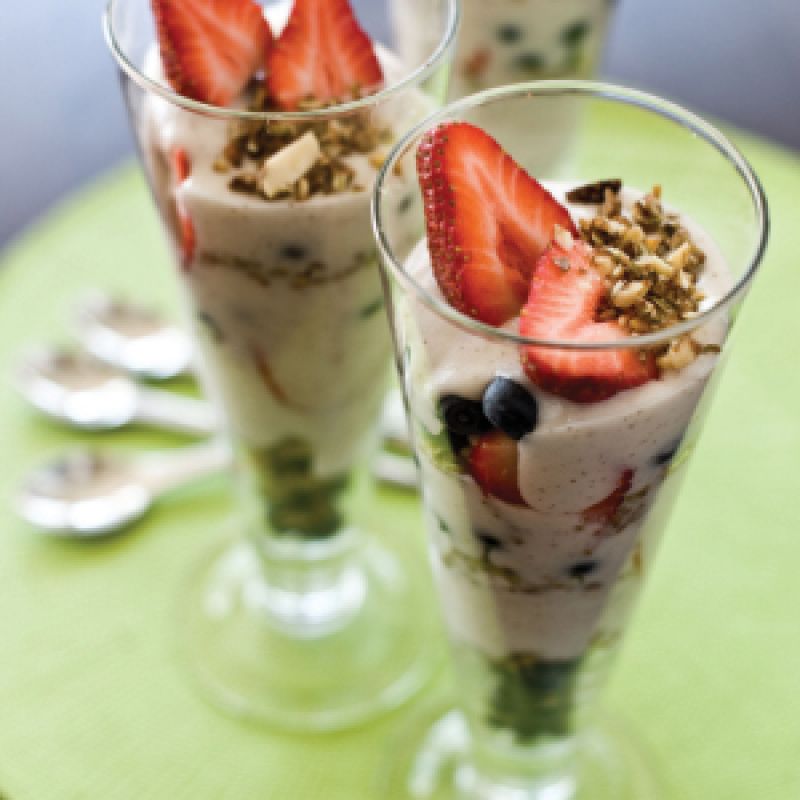 Open coconuts by first removing most of husk near pointed top. Then, using a heavy cleaver, crack top of coconut with the bottom corner of the blade. Using the edge, pry the coconut open just enough to pour out the water into a small bowl. Once empty, lay coconut on its side and slice across through the open slit to completely expose the inside. Scrape soft, white flesh out completely. Put all ingredients except berries in a high-powered blender and blend until smooth, scraping sides often. Slice berries if they are large. In tall glasses, alternate layers of berries and mousse until full. Serve immediately, or chill overnight to set (mousse will be as firm as ice cream).