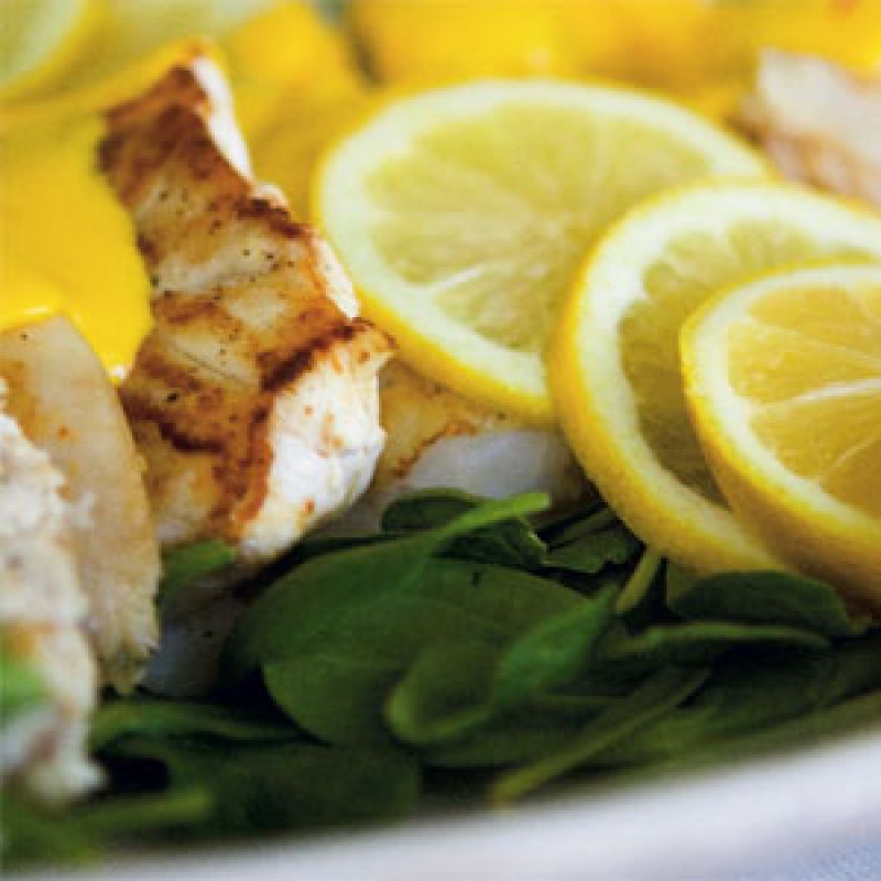 While the fillets are roasting, put the teaspoon of olive oil and a pinch of kosher salt into a sauté pan and heat. Add the spinach and toss over medium-high heat until just wilted. Place the spinach on a platter. Place the grouper fillets on the spinach and nap them with the hollandaise sauce.