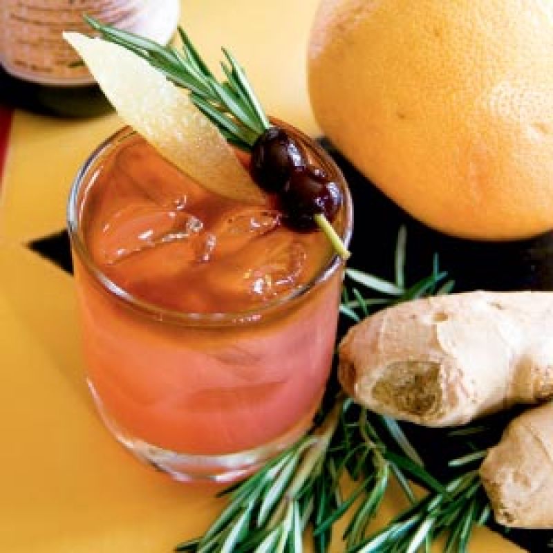 Add ice, gin, vermouth, bitters, grapefruit juice, and ginger syrup to a cocktail shaker. Stir and strain into an ice-filled double rocks glass. Pour Fernet-Branca on drink surface. Garnish with ginger, rosemary, and cherries.