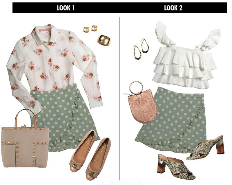 Add polka dots and ruffles to the wrap-skirt style, and you have a piece polished enough for work and flirty enough for play. To mix patterns, stick to a simple palette