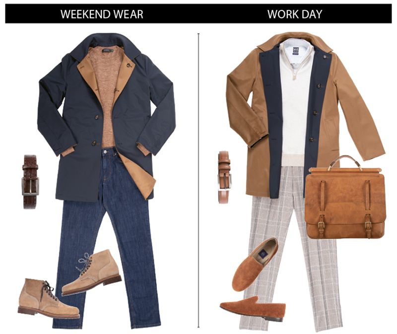 Get double duty Dapper in this reversible trench. Pair with jeans for a casual weekend look. then go Full dandy by adding tailored slacks and suede loafers for work.