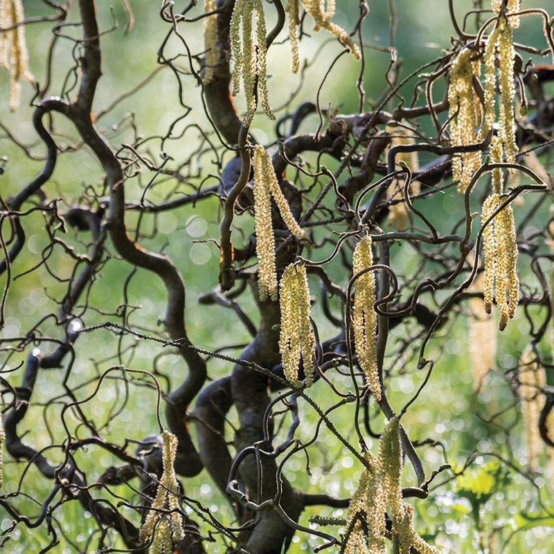 A contorted variety of the European filbert tree, Harry Lauder’s walking stick is named for a Scottish vaudevillian performer who entertained early-20th-century audiences with theatrics that featured his cane, devised from a spiraling filbert branch.