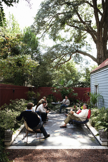 Artist and consummate entertainer Christophe Drumain welcomes family and friends to New Year’s Day brunch in his Riverland Terrace garden, complete with all the fixings from his native France{Menu} Caviar-Stuffed Eggs Saffron Shrimp & Assorted Salads Venison, Duck, and Rabbit Pâtés Selection of Stuffed Dates & Prunes Convincing Christophe Drumain that “there’s nothing to eat” is a difficult task. Just ask his friends, who claim he can whip something up from even the most barren refrigerator. “My clients laugh because I’ll design their yards and end up cooking for them,” says the French-born Christophe. “I enjoy food, but even more so, I enjoy the sense of family that comes with cooking.” And it’s no wonder: the Bordeaux School of Architecture graduate grew up helping his mother organize dinner parties. “My father was in the French army, so we would often host parties with military officials, including some of the generals. This taught me that it’s so important to know how to entertain, how to make people feel comfortable.” Christophe happily carried these lessons with him to the States; following a post-graduate degree program at Harvard, for which he received a full scholarship, the architect-turned-landscape artist met Scott Parker, who had just opened master planning firm DesignWorks in Charleston. Now a partner in the company, Christophe has sketched out the details of thousands of exterior plans. As for his own Riverland Terrace backyard? In recent years, it’s become a palette for artistry of all kinds. “In Charleston, you can use your garden year-round, so you want to design a space that you can spend as much time in as possible,” says Christophe. For him, that means forgoing a traditional lawn in favor of pavers, glass, and painted concrete. “I don’t really have the time to clip or trim,” he says. That’s not to say the James Island resident isn’t willing to put in a little elbow grease—it’s just that artistic projects like garden murals are more his speed. “I painted a koi pond onto a concrete slab using alkaline outdoor paint,” he says of the rectangular garden alcove that formerly served as a parking space. “I had always wanted a real koi pond, but as a landscape designer, I know how much they cost and how hard they are to maintain.” So Christophe decided to paint what he couldn’t install. A nearby water-jug fountain “feeds” the faux pond, while a generous selection of papyrus and water plants, most salvaged from friends’ yards, completes the illusion. But again, Christophe’s garden artistry is only part of the story. With his mom and entertaining mentor, Catherine, visiting from France—her first trip to the United States since Christophe’s Harvard graduation—with his aunt, Micheline, Christophe readied his back garden for a festive New Year’s Day brunch. The trio combined their traditional French flavors with his friends’ offerings to create a feast of pâtés, dried fruits, and even a vegan Yule log. “It’s about a great diversity of food eaten in only small amounts,” he says, pointing to his friend Ken Immer of vegan culinary outfit OM Cooking. “I could take on everything on my own, but Ken is educated in French cooking, so he mixes his good, raw foods with these cooking methods. It’s all about the exchange of talent and ideas.” Christophe notes too that as large a role as food always plays, it’s never the main event. “The French love to feed people,” he says, “but it’s really about the social element that goes with it. You never remember what you wore or even what you ate, but you remember the experience forever. The best laugh I ever had was in the kitchen with my aunt and my mother. We were dropping dishes and falling on the floor laughing,” he says, “That’s what I’ll remember most, and that’s why you remember the way food smelled as a child for the rest of your life.” In France, explains Christophe, you can tell that people are from the same family when they sing the same tunes and cook the same recipes. “Food links me to my roots,” explains Christophe. “It’s the roots of who you are. You may lose a language, but you never lose those ties to family and food, and it’s an amazing experience to share that with friends.”