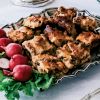■ Think about how a dish will look when it is empty. “This is where garnishes come into play. A layer of lettuce beneath the shrimp keeps the bowl from looking ravished; Large radishes from the farmers market bring color to the egg strata platter—wipe them with vegetable oil to add a gleam.”