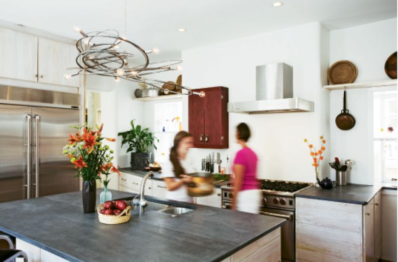 window openings with a sensuous curve, adding a Southwest adobe feel to the traditional wall finish. Windows, restored with enhanced casements and deep sills, are perfect for showcasing Nancy’s glassware and whimsical collections. Sunlight sieves in from both sides of the centerpiece kitchen, marinating it in light. This is where Nancy’s design taste—honed with the help of Charlotte-based decorator Jim Lavesque—reflects her talent for accentuating flavor. She combined soapstone countertops, wood cabinets, steel accents, and mod lighting to achieve the décor equivalent of a soufflé that doesn’t fall: a room that’s both minimalist and warm, earthy and swanky. “It’s my dream kitchen,” Nancy says. “I love that there’s a place for everything, and it’s intuitive. At Christmas, we’ll have six people cooking in here, and it works.”