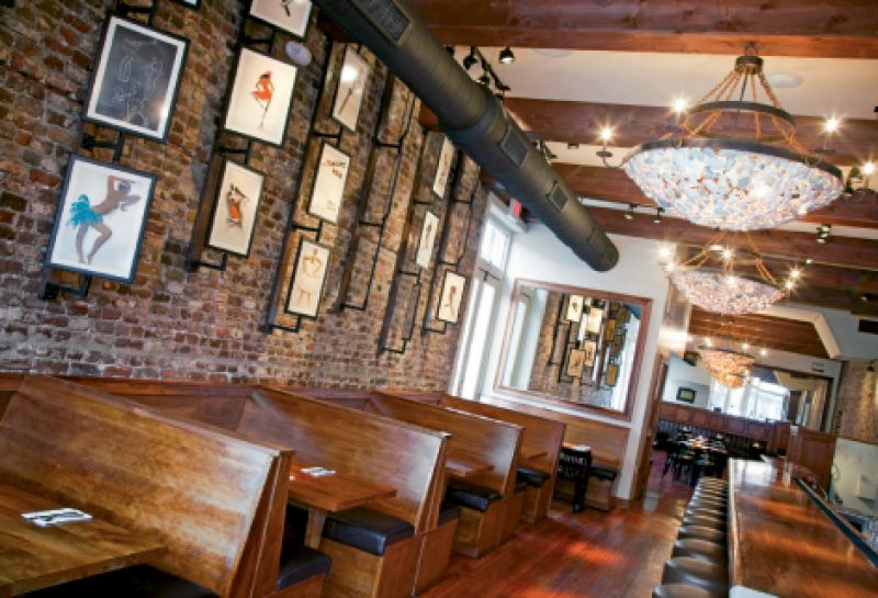 Step inside the recently opened eatery, and you’ll be struck by contemporary elements such as expansive windows, a street-view raw bar, and oyster shell light fixtures that hint at the proximity to the harbor. But even combined with new brick and gleaming wood, these don’t obliterate the historical flavor lent by authentic maps and documents depicting the area’s past, an original column from the building’s former cast-iron storefront, and art that celebrates jazz’s influence on Charleston’s history. The overall result is that of a handsome seafood house with an easy spirit and a slightly nostalgic air.