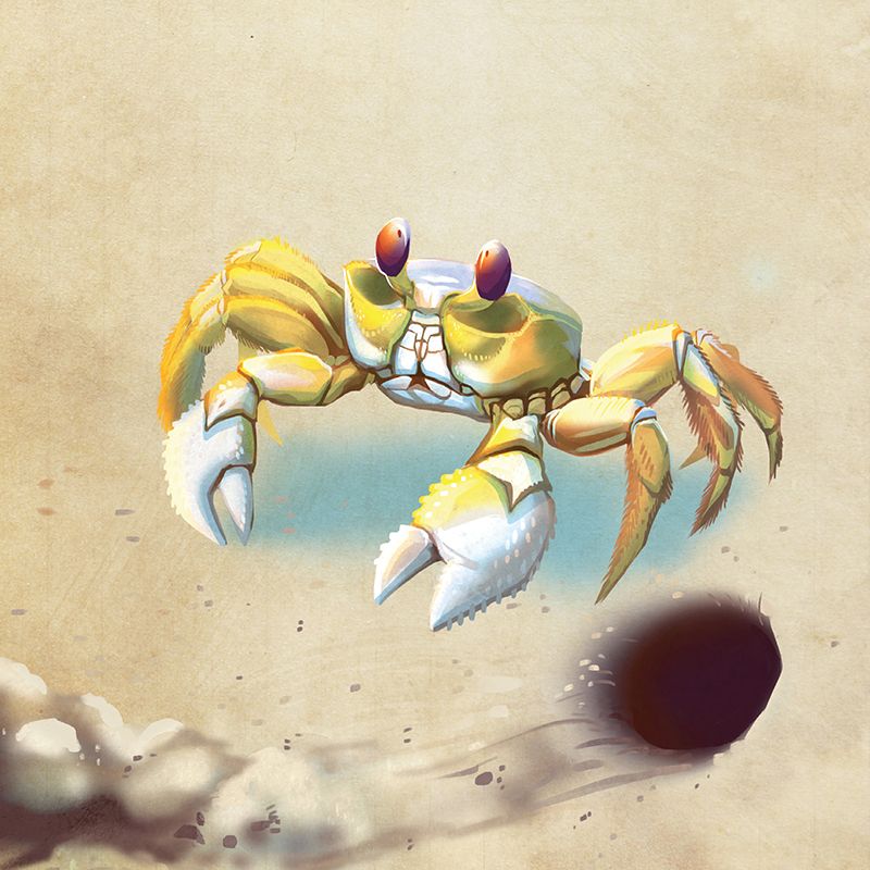 Chillin’ Chelipads: They have two large claws (chelipads) and four pairs of walking legs, the “quadrata” of their scientific name. When ghost crabs run fast, they only use two pairs of these legs, raising their third and fourth pairs off the ground while they scamper sideways (sometimes as fast as 10 mph). While male fiddler crabs possess one oversized claw, both male and female ghost crabs have claws the same size. They also communicate by striking the ground with their claws and make a bubbling sound through stridulation, the rubbing together of their legs.