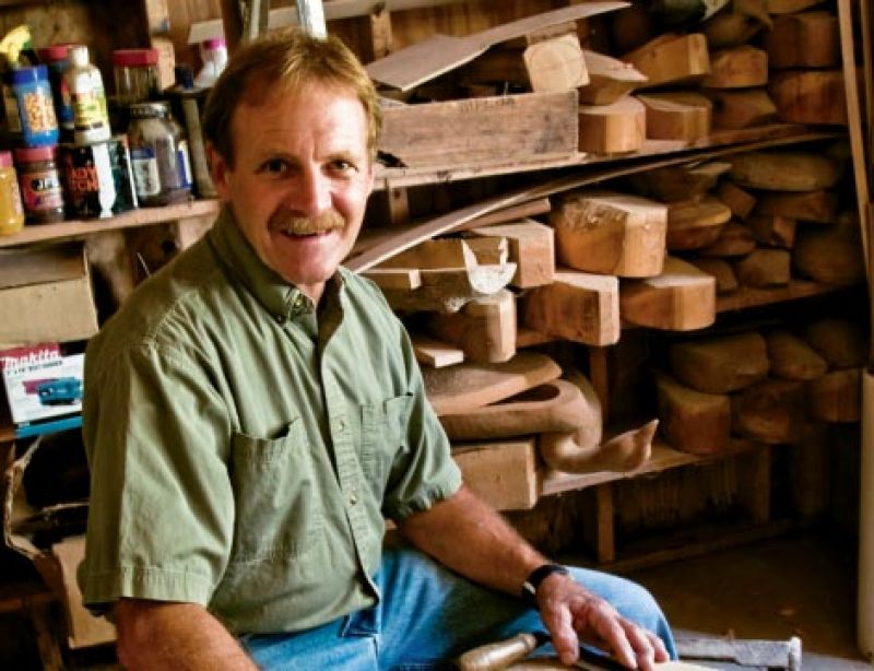 When the sap is down, Boozer harvests Eastern white cedar from deep in the swamp near his creekfront spread outside Meggett. This cedar, which looks similar to cypress and favors the same environment, is light, durable, and easy to work. After lying several months submerged in water right where they fall, the logs are hauled to a friend’s sawmill to be cut to the artist’s specs. Then Boozer air cures the wood for two years before it’s ready to work.