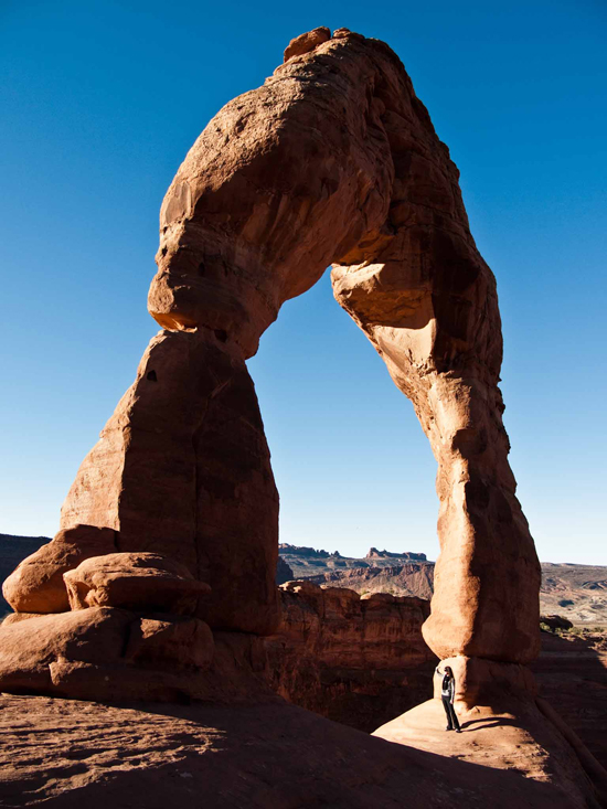 The next morning, our guide, Scrivner, makes sure we’re up early for a hike to Delicate Arch in Arches National Park. Just before the entrance, I spot a single Airstream camper parked with its shiny metal glinting at the base of a tall brick-red ridge. During the few miles to the trailhead, we pass seemingly endless rust-colored rocks in the morning light, some precariously balanced on narrow spires. A mass of towering, spiky rocks in the distance resemble tall flames licking the sky. Our early start seems to have worked. We see only two other people on the way out into the wind-sculpted, water-eroded wilds. The hike’s a mere three miles round trip, but takes two hours with about 500 feet of elevation gain and the final portion on narrow ledges.