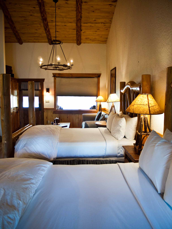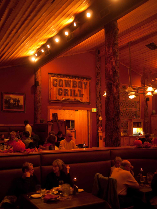 No matter, I’d already seen pastures of horses on the walk from the cabin to the lodge, so we decide to mosey along the fence lines toward the stables. A group ride is about to start, and soon we’re matched with horses and Western saddles and invited to borrow cowboy hats and bandanas. My ride, Pinky, is gentle and pony-size, and I follow just a few horses behind the guide, Melissa, a tall blonde in leather chaps on a gray horse named Mr. Jones. (Later in the ride, she’ll stand easily on his back.)