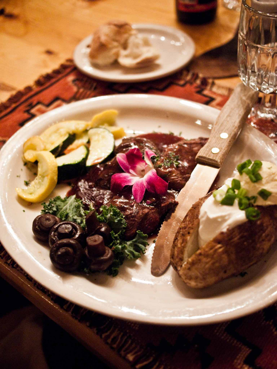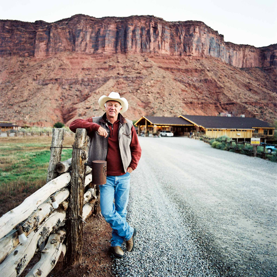 At dinner that night, we meet Colin Fryer, a real cowboy in a well-faded denim shirt, blue jeans, and a crisp cowboy hat. The owner of Red Cliffs Lodge, he explains that he stopped driving cattle so he can focus on the place, which he’s built over the past decade. (One of his favorite movies shot in Moab? The 1964 Western epic Cheyenne Autumn.) Fryer has a coolness that reminds me of Peter Fonda, and when we sit for dinner, he orders bottles of wine for the table from the ranch’s own Castle Creek Winery and tells the unlikely story of how he got started in business by selling eight-track tapes, black-light posters, and car stereos out of a van in Salt Lake City.