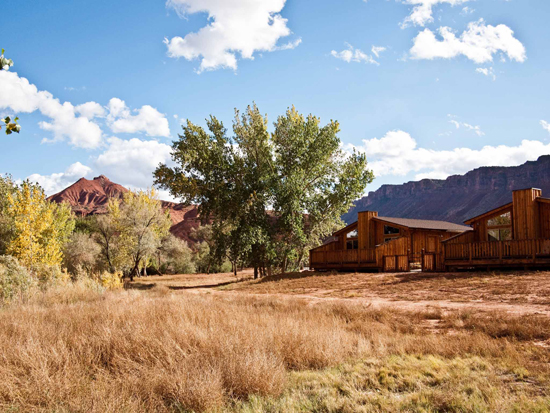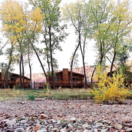 Well past sundown and after dinners of cowboy-hearty beef soup and wild salmon upstairs at the Sorrel River Ranch a few miles outside of Moab, we check into a cabin at the next ranch over, the Red Cliffs Lodge. The sky has turned a deep black, and we’re tired from the day of travel (the connecting flights total about six hours), so it isn’t until the next morning that I realize just where we’d slept.