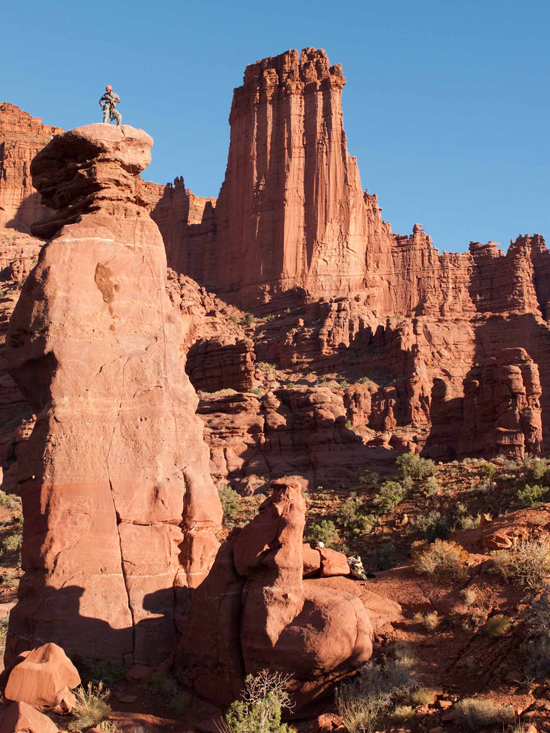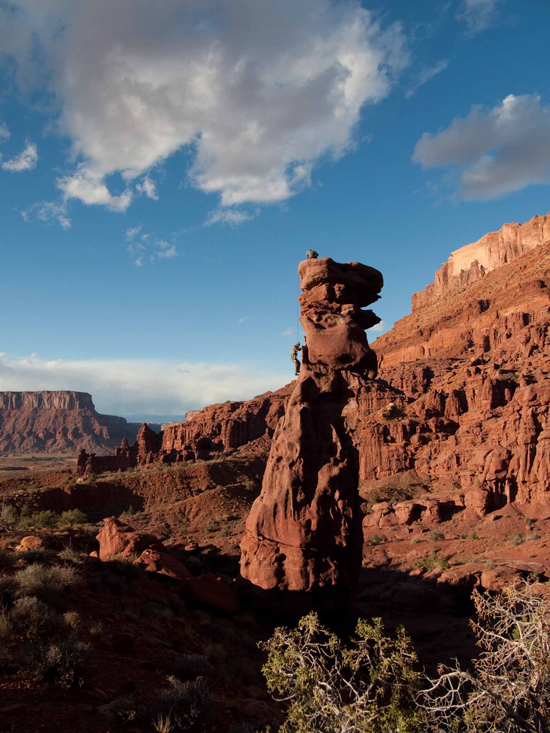 That afternoon at Solfun, a mountain-bike tour company, we meet Allan Poertner, who explains that he founded the outfitter in Denver in 2000. Then, on a trip to southern Utah a few years later, he and his wife decided to open in Moab, too, “because the scenery blew us away,” he says. We’re soon pedaling on slickrock and wheeling past cacti while Poertner reminds everyone of safety and techniques—and keeps us laughing. The surface of the plateau in the Merrimac Butte area north of Moab looks like Mars, and while he leads, Poertner tells stories of crazy wipeouts and even guide jokes such as, “What do you call a snowboard instructor who just broke up with his girlfriend?… Homeless.”