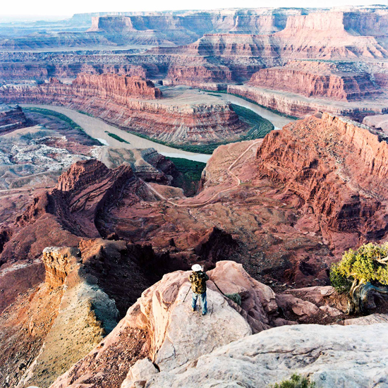 Driving up a two-lane road to about 6,000 feet elevation, we park at a near-empty lot and visitors center. The sun is falling fast and casting glows of orange, gold, and even purple on balancing rocks that tower upward here and there. I get out of the van and immediately feel the chill in the air. Pulling up the zipper on my jacket, I follow the path to the overlook. It’s a view we’ve all seen before—in movies and TV commercials and likely in our imaginations. The name “Dead Horse” is the stuff of a hazy legend of horses trapped on the narrow end of a plateau, 2,000 feet above a horseshoe-shaped bend in the Colorado River. Looking out, down, and up, what I notice most is the nearly impossible quiet. I can’t hear anything of the rust-brown water in the winding river so far below. As the sky darkens, the temperatures drop across the huge expanse. The silence is tremendous on my first sunset in Utah, and I feel small to the world.