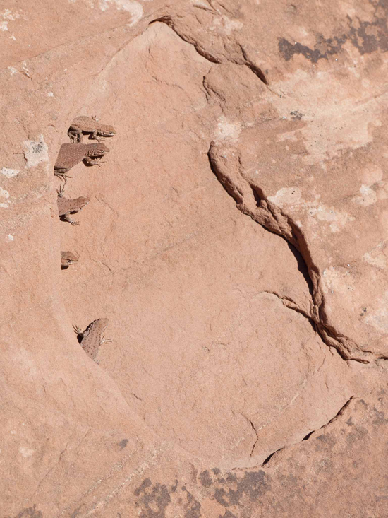 And on the drive out, I get one more, much smaller, glimpse of Utah. We’re in the van on an access road from Dead Horse by then, when five or six mule deer emerge from the brush and step past. Ears up, they stop for a few seconds on the pavement, so near that I can see their alert doe eyes. Everything is perfectly still until one deer blinks its thick lashes. Then, just like that, they’re off.