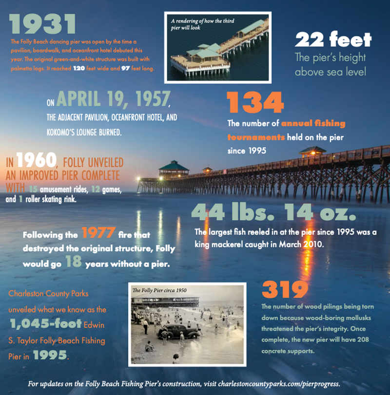 For updates on the Folly Beach Fishing Pier’s construction, visit charlestoncountyparks.com/pierprogress.
