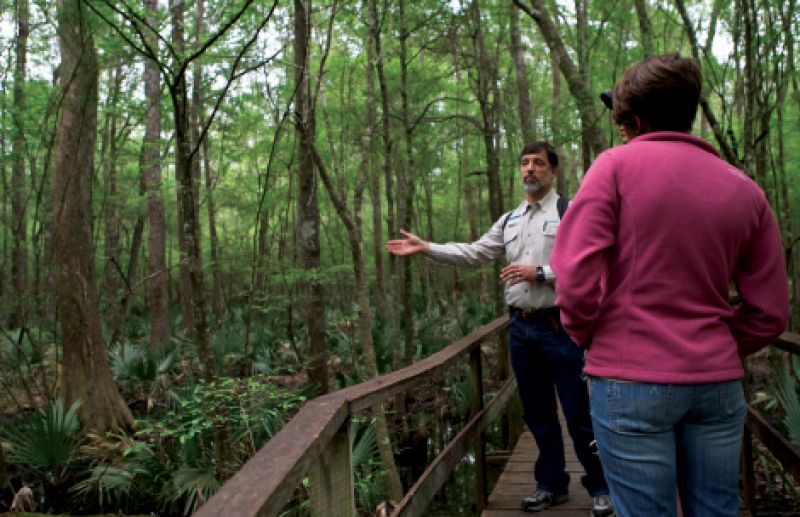 It’s been like this the whole evening—bugs clicking, mud popping, and cypresses and tupelos creaking to each other, cracking open the night air and speaking an ancient language we can’t translate. This pocket of trees happens to be one of two old-growth stands in the state, meaning they’ve never been cleared or otherwise altered by man. Halfway through the walk, Mike explained that the oldest cypress here—a bit tired-looking and scrawny, at least compared to her whippersnapper neighbors—is nearly 1,600 years old. I stared through the dark at the gal in question, unmarked for her own protection. Who, or what, could stand here since 400 A.D. and still be a looker? I reached out to rest my palm on the tree’s side, hoping to give a little reverence and catch some sort of vibe, too. As I stood there, a little odd-bird-out petting the tree while the group circles Mike, he told us that the roots of these brilliant trees span out shallow but far—the length of a football field—and send up stumpy knees that act like tent stakes, which speaks to their longevity.