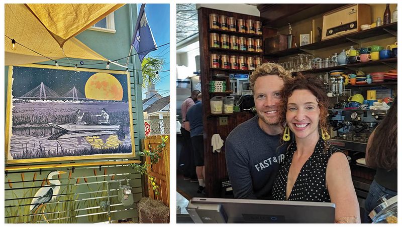 Dos Bandidos artists Candace Patterson and Will Kiser are known for creating a sense of place in their silkscreen prints of popular hangouts such as Moe’s Crosstown and The Royal American. When Market Street’s City Lights Coffee, where Candace was a manager, closed in 2021, she sought to create a new physical space to foster community around a shared appreciation of art. Partnering with photographer and fellow former City Lights employee Gregg Lambton-Carr, they opened City Lights Eastside on Line Street in April 2024. “We have home, we have work…my hope is that we get to be a ‘third place’ for as many people as possible,” says Candace.