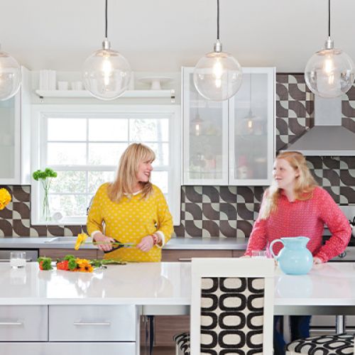 Personal touches are also evident throughout. A walnut table once used in Lynne’s art studio was reimagined as a console and given a new home behind the sofa. “If you look closely, you’ll see it’s still flecked with paint,” Lynne notes. And flanking that table are two turquoise chairs—made in the style of a classic Eames design—they’ve owned for years. Most evenings, Lynne and Steve can be found perched at this well-loved table, enjoying dinner and a glass of wine. “We always toast to Thursdays, no matter what day of the week it is,” Lynne says. “Thursdays are our favorite, because they mean Friday’s on the horizon.”