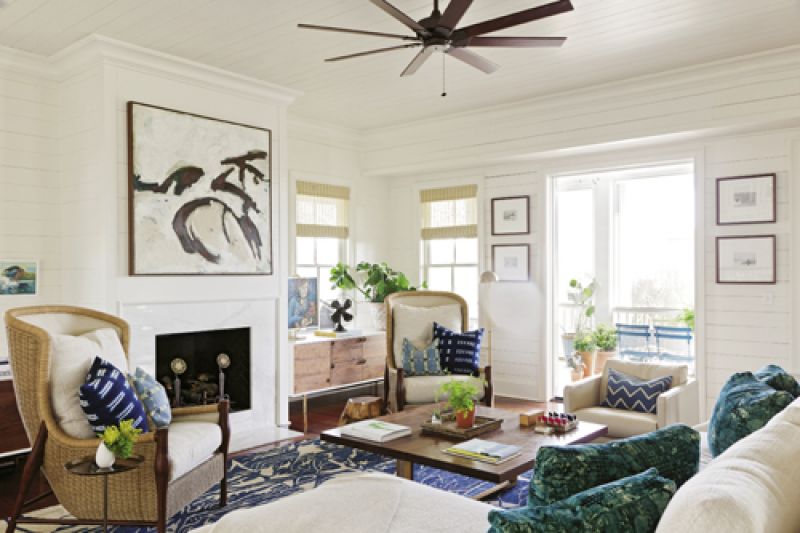 Visiting Lynne and Steve Hamontree today, it’s easy to get the impression they’ve been happily settled in their Sullivan’s Island abode since forever. In the airy second-floor living room, Lynne tucks into her favorite chair—one of two sculptural egg-shaped numbers by McGuire that ooze Bohemian chic—and talks excitedly about the room’s design, zeroing in on a newly acquired painting that hangs nearby. “It’s by Kim Frohsin, a Bay Area artist and one of my idols,” she gushes. That’s serious praise coming from Lynne, a noted artist herself who recently landed a deal with Serena & Lily—this fall, the posh retailer will carry a run of her ink line paintings of nude figures. Ask husband Steve, a California-raised surfer who loves the laid-back culture and cresting waves of his home state, to point out the house’s best features, and he might direct you to the screened-in porch, where you can catch the ocean breeze, or the entryway, where one of his boards is displayed as art. Either way, the residence, with its cool coastal palette and art-filled rooms, is a thoughtful reflection of its owners, right down to the surf books piled on the coffee table. But it wasn’t always this way. The couple is on the tail end of a two-year interior overhaul—led by area design pro Cortney Bishop—that helped them turn a spec home into the uber-personalized oasis of their dreams.
