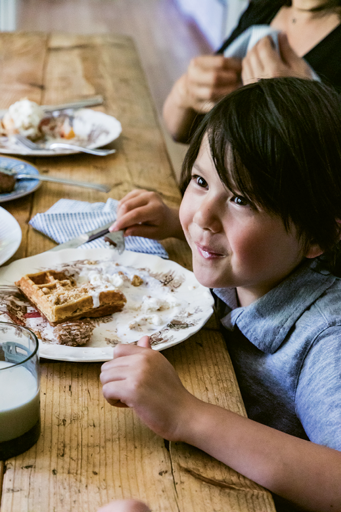 Before heading out with the truck for weekend afternoons, Wong will sometimes rustle up a dish inspired by this memory. Her version involves Anson Mills rice flour, which renders the waffles airy and crisp with custardy centers. Life Raft Treats maple cheesecake ice cream is heaped on top, then showered with brown butter crumble. After breakfast, the boys burn off the sugar by climbing trees. They dangle and squeal, playing chase around the magnolia’s massive trunk, or by winding through the grapefruit branches, dodging pendulous fruit. Wong says they are endlessly astonished by the life of each plant, how they change and blossom. This is how she wants people to feel about food—giddy and awestruck, returning to a place of wonder.