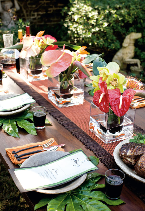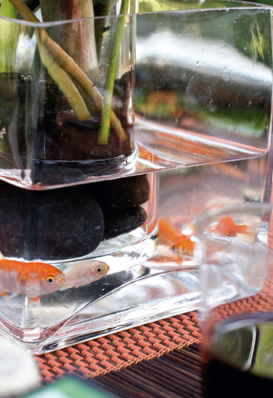 For an added and easy-to-accomplish dose of drama, treat your guests to a peek at goldfish darting about the center of the table. To make these centerpieces, root birds of paradise, anthurium, and aspidistra in river rocks and place the container inside a separate square vase; add water to both vessels, along with a few brightly hued fish in the outer container.