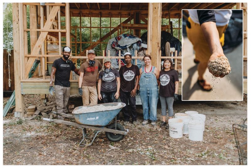 Root Down Building Collective is testing sustainable building techniques and materials, such as hempcrete (inset), to determine if they can be used effectively on a broader scale in the Lowcountry.