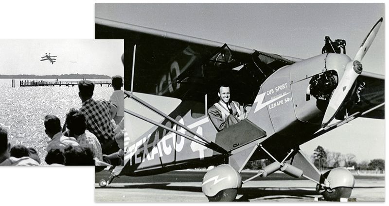 (Left) A gathered crowd watches Bevo Howard perform over Charleston Harbor. (Right) He’s shown in the early ’40s in the Piper Cub he flew for all five of his world championship wins.