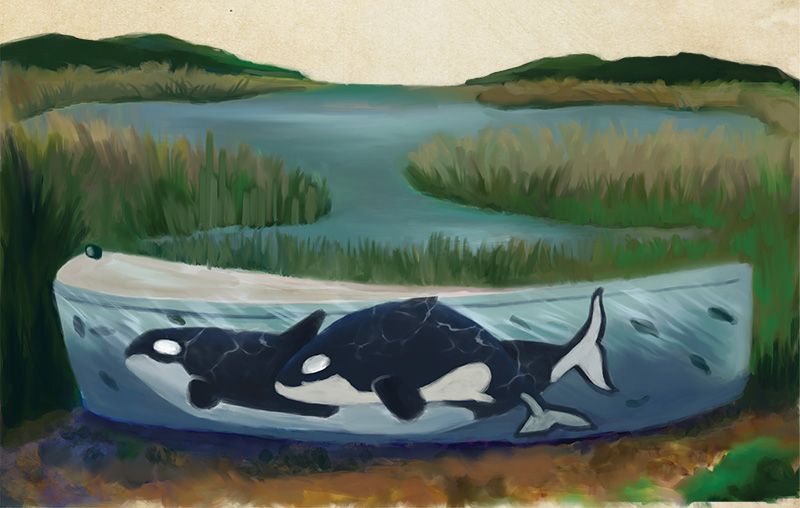ARTS & CRAFT At times, the boat has become an outdoor canvas for artists to display their work. One favorite painting, depicted here, is of an orca mother and her calf by wildlife artist Tiffany Maser. Noted one local, “Sometimes it’s tough to see such good work get repainted, but that’s the Folly Boat. She’s there for everybody.”
