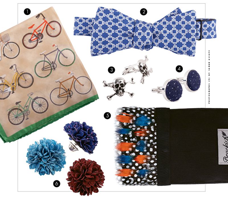 6. Ike Behar “Dandy” boutonnieres in cobalt/pink, aqua, and red, $45 each at Ike Behar