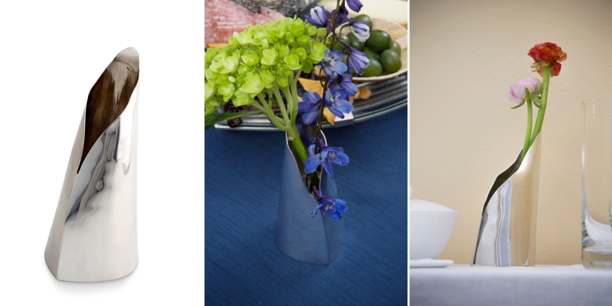 Haislip’s sterling silver “Link Earrings,“ “Flight of Fancy Baby Cup,“ and “Poppy Bowl”