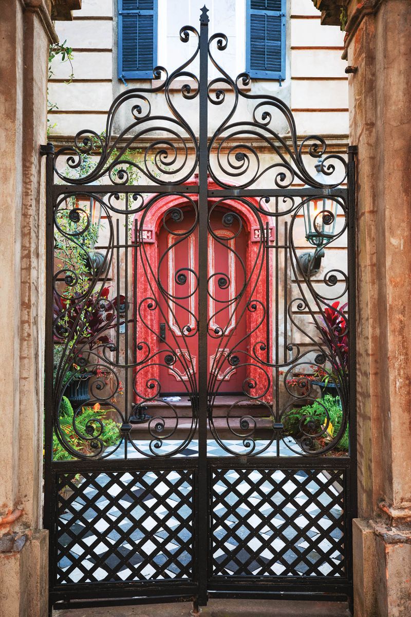 With an intricate design featuring swords and spears, the famed Sword Gates aren’t quite what you’d expect to see fronting a gracious mansion. Crafted by German-born artisan Christopher Werner (1805–1875) in the 1840s, the motif of strength and power was intended for a very different building: the city’s 1830s Guard House, long since demolished. Some accounts say that Werner’s gate was never actually installed at the Guard House, because the city refused to pay its high price. Another story is that, confused by the phrase “pair of gates,” Werner erroneously crafted two pairs—and the spare one went to Legare Street.